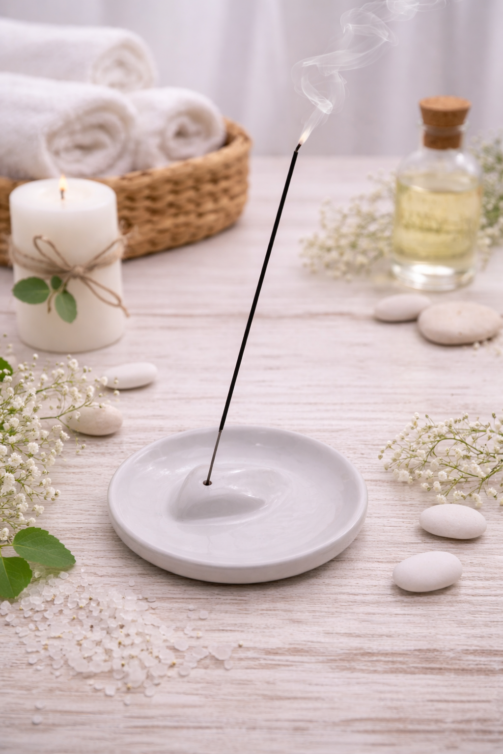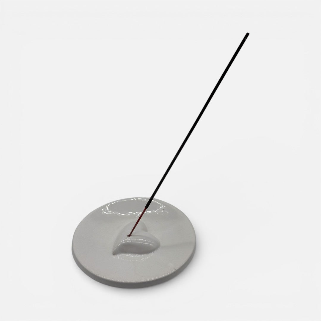 Elegante brucia incensi in ceramica bianca con cuore in rilievo tono su tono, un oggetto raffinato e minimal ideale per diffondere profumi e creare un’atmosfera rilassante e armoniosa. Il design essenziale con cuore centrale dona un tocco delicato e simbolico, perfetto come bomboniera o piccolo complemento d’arredo.