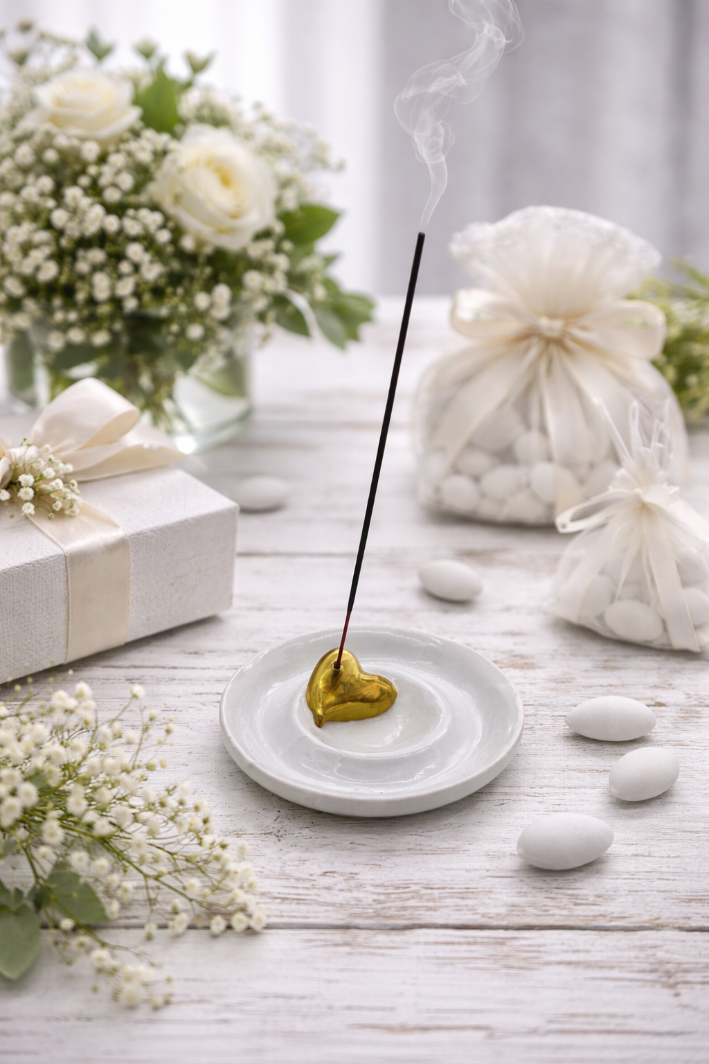 Delicato brucia incensi in ceramica bianca con cuore dorato, un oggetto decorativo raffinato che unisce eleganza e funzionalità. La forma armoniosa con il cuore in rilievo color oro al centro rende questo accessorio perfetto come bomboniera o complemento d’arredo, ideale per diffondere profumi e creare un’atmosfera rilassante e accogliente.