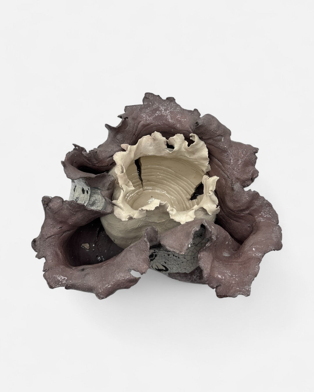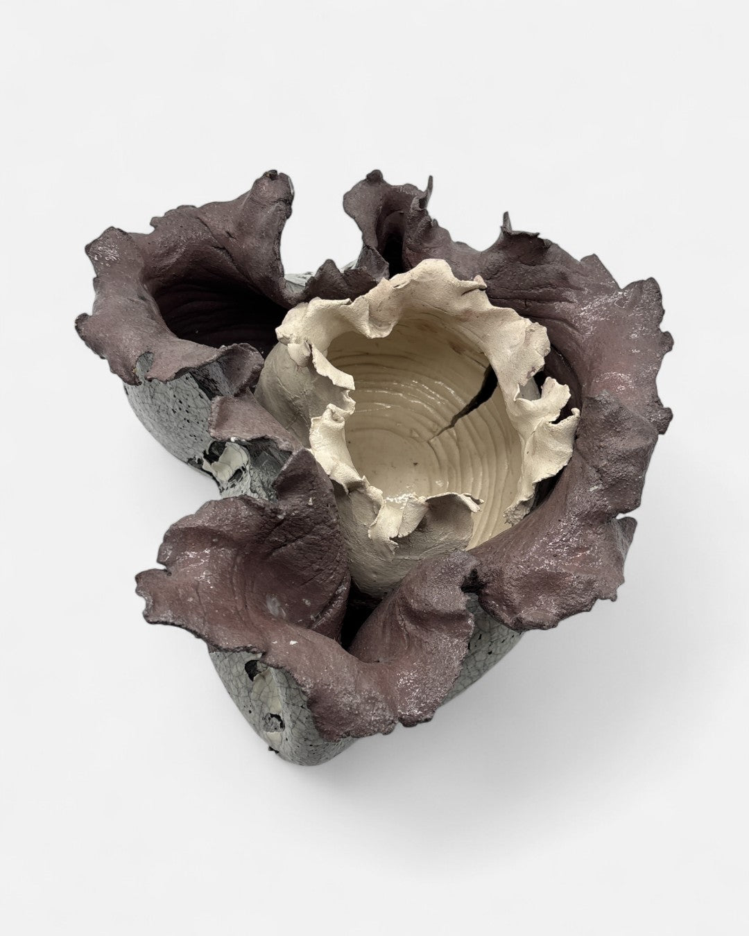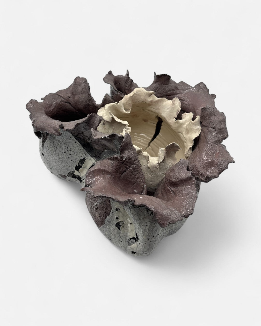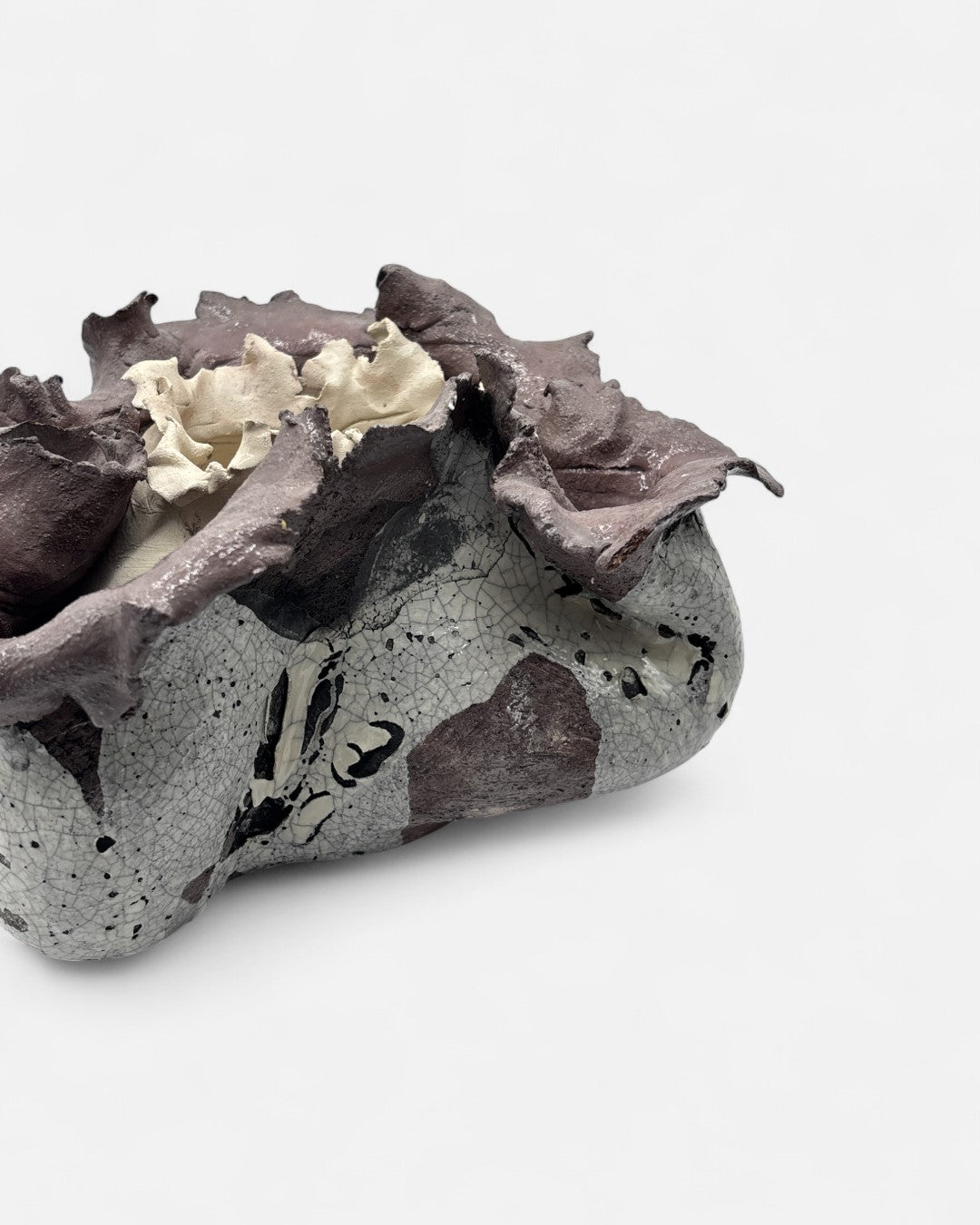 Il doppio vaso A39 è un oggetto decorativo in ceramica realizzato a mano, caratterizzato da una forma originale con due cavità complementari e una raffinata combinazione di smalti bianco e nero. Un pezzo scultoreo e funzionale che unisce estetica e creatività in un’unica presenza.