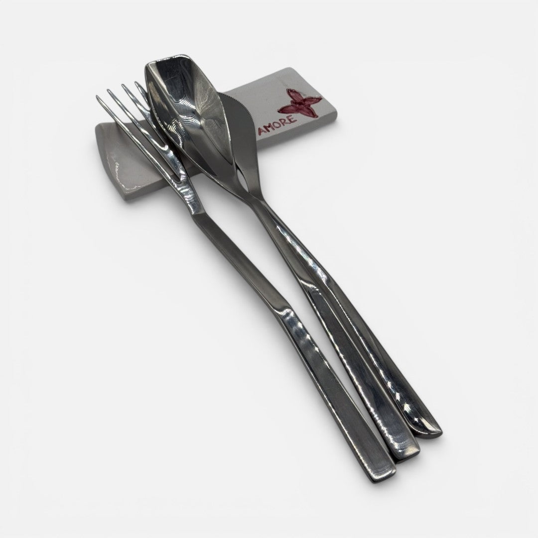Elegante poggiaposate in ceramica bianca decorato con farfalla e scritta “Amore” nei toni bordeaux, perfetto per arricchire la tavola con un dettaglio raffinato e decorativo. Il design semplice ma distintivo valorizza la mise en place mantenendo le posate sollevate dalla tovaglia e ordinate.