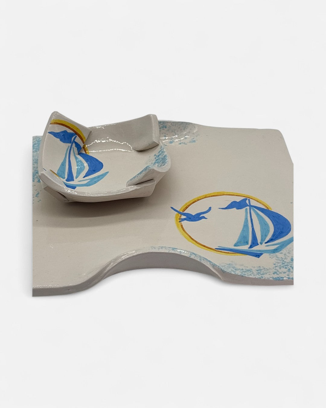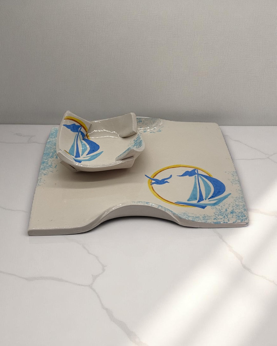 Aggiungi un tocco di freschezza e stile alla tua tavola con il nostro Set Aperitivo Decorato a Mano Marino - A07. Completamente realizzato a mano, questo set esclusivo comprende due vassoi e due ciotole, perfetto per servire antipasti, stuzzichini o aperitivi con un design sofisticato e un colore marino che richiama la tranquillità del mare.