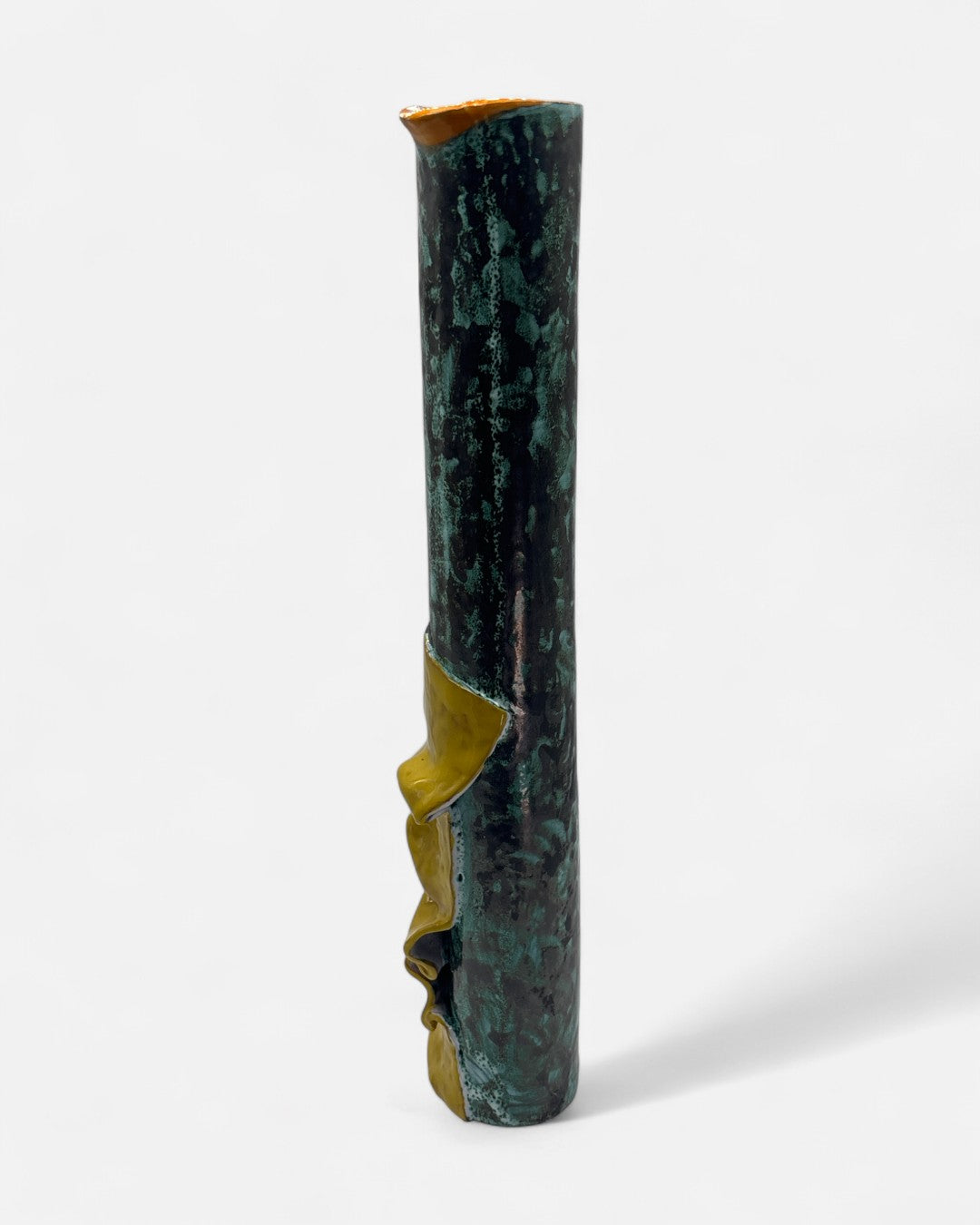 La superficie riflettente ramina e il vibrante giallo creano un contrasto visivo affascinante, mentre la sua altezza lo rende ideale per decorare angoli vuoti, mensole o centrotavola. Ogni vaso è unico, con leggere variazioni dovute alla lavorazione artigianale.