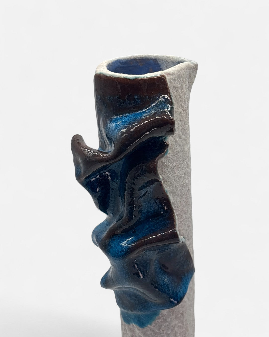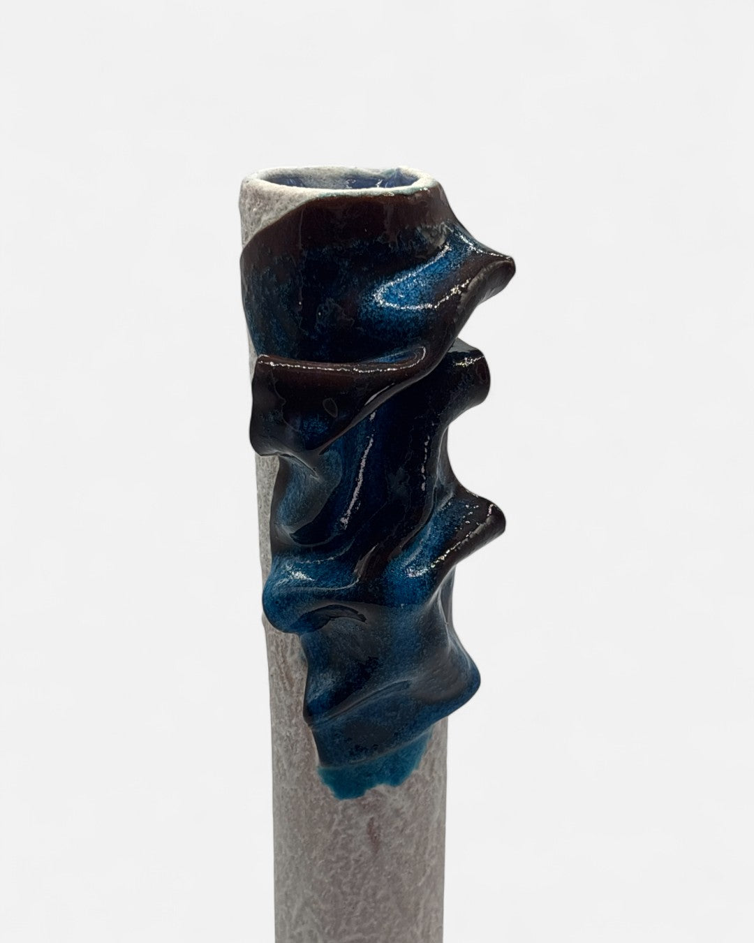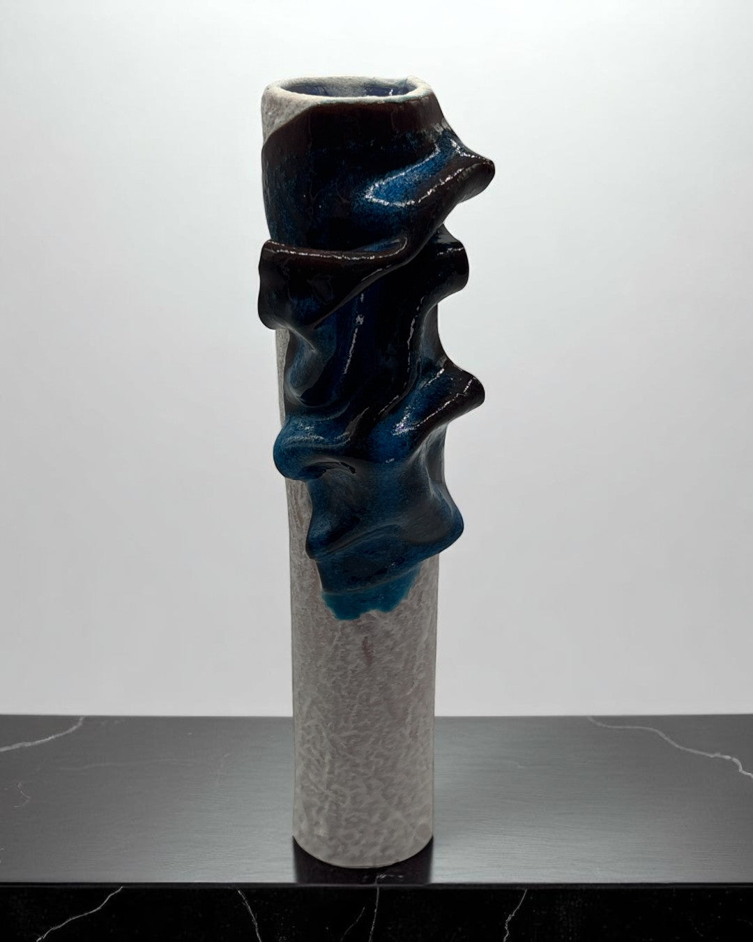 Dal design essenziale e slanciato, il vaso A31 è un raffinato oggetto in ceramica lavorato a mano, caratterizzato da una superficie vetrosa in tonalità turchese che cattura la luce e valorizza ogni dettaglio. La sua forma tubolare lo rende ideale per composizioni monofiore o piccoli rami decorativi.